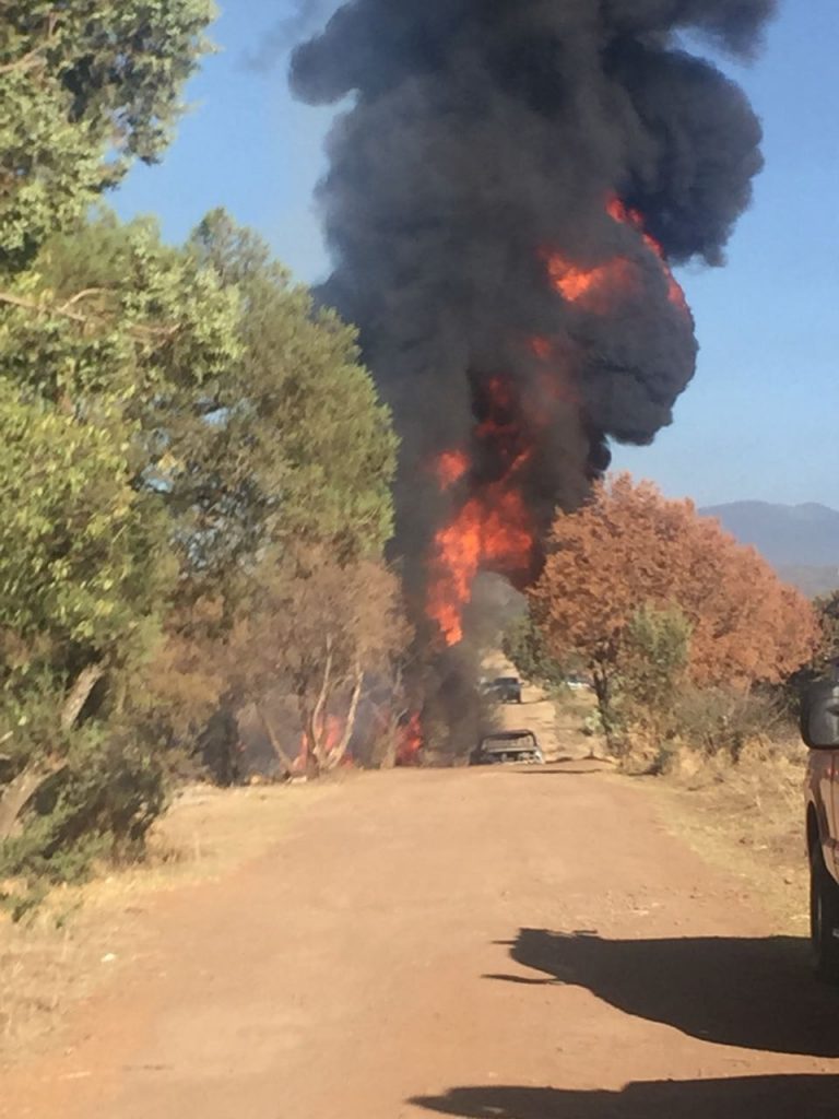 Arde toma clandestina en ducto de Pemex en el municipio de Santiago, Tulantepec.