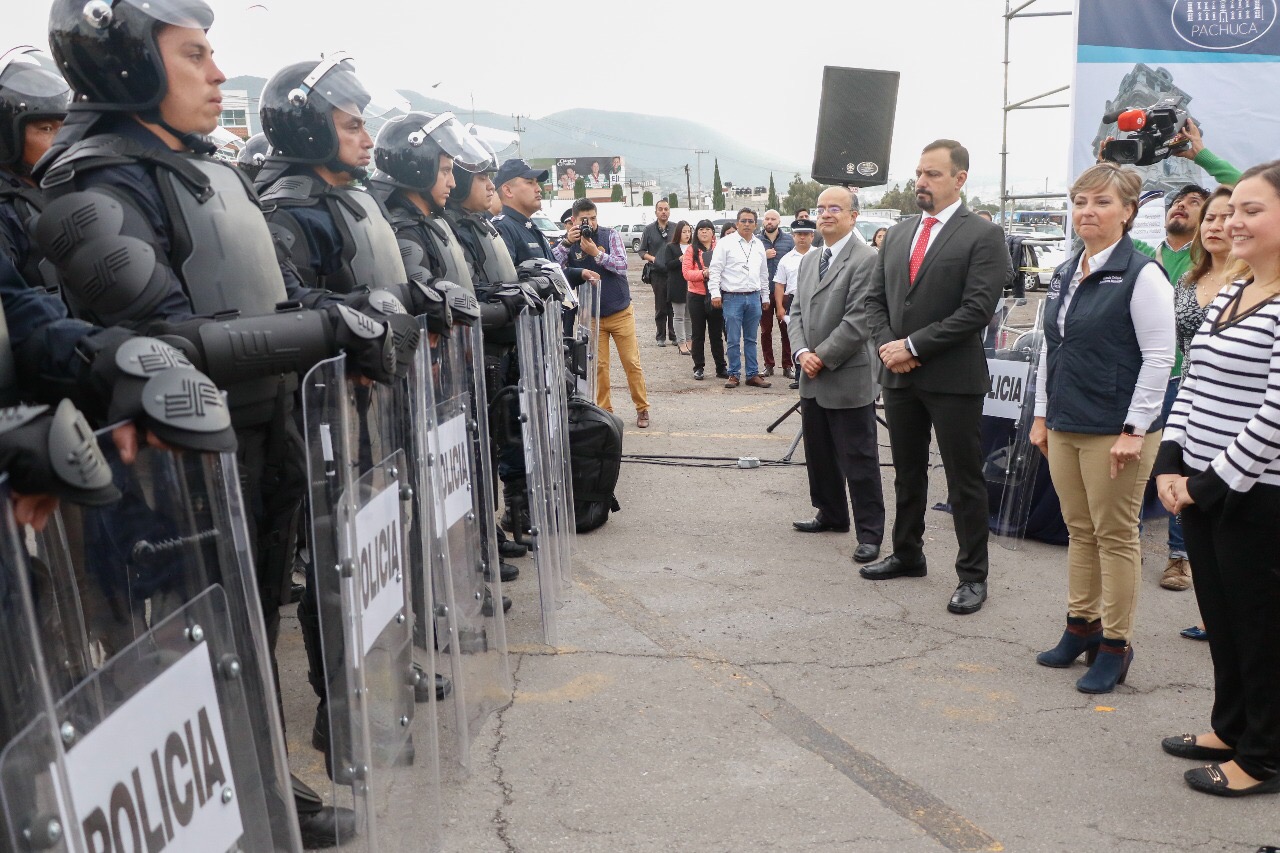 La alcaldesa de Pachuca, Yolanda Tellería Beltrán, entregó equipamiento a elementos de la Policía Municipal para reforzar el combate a la delincuencia, además de reconocer a oficiales destacados que lograron detener a presuntos responsables de hechos constitutivos de delitos.