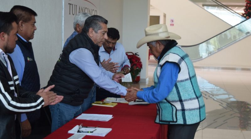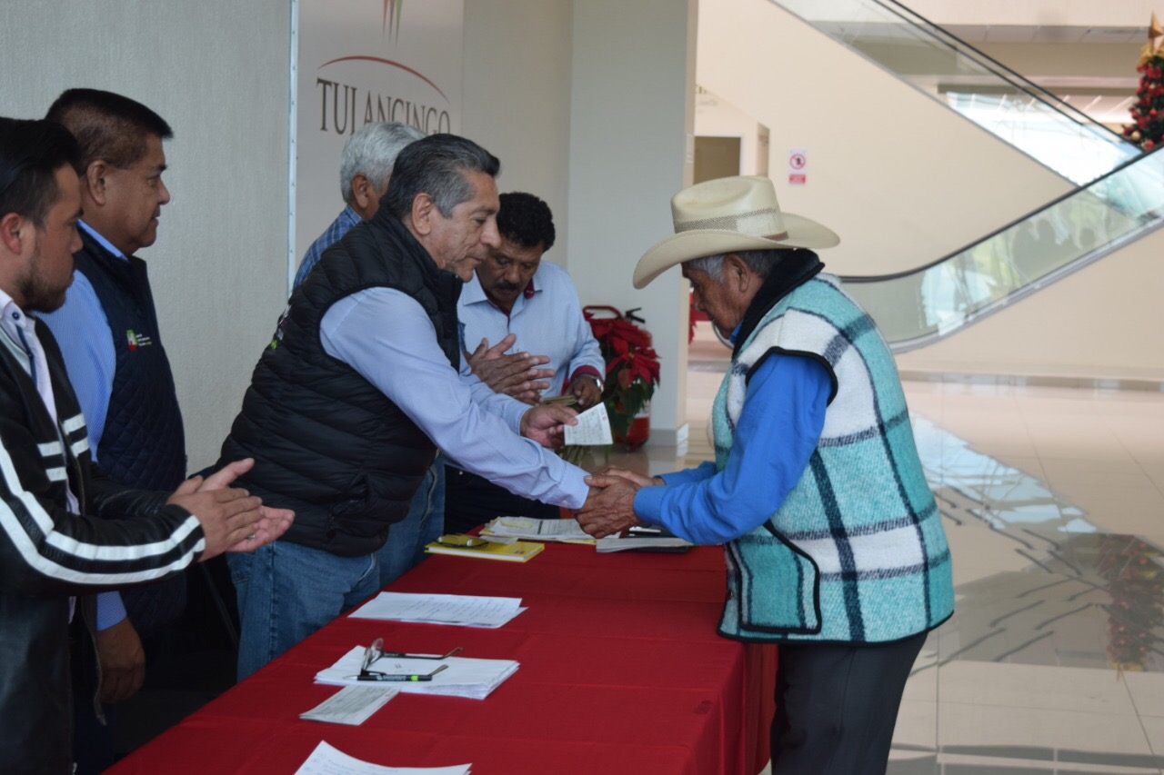 Veintisiete productores de Tulancingo y 10 de Cuautepec recibieron de manos de Heriberto González Pérez, director de Agricultura de la Secretaria de Desarrollo Agropecuario (SEGADRO) y el Secretario de Fomento Económico Juan García Mellado, cheques de indemnización a parcelas siniestradas por sequía en el ciclo primavera- verano 2018.