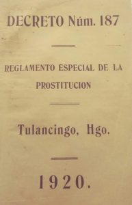 En Tulancingo, en diciembre de 1920 se autorizó un reglamento especial de la prostitución que entró en vigencia en 1921. No sabemos con exactitud si existió otro con anterioridad, dicho reglamento de prostitución fue aprobado en el decreto número 187 por la asamblea municipal. Aunque también se encuentran en el Archivo municipal de Tulancingo, padrones que hablan de mujeres registradas desde 1893, pagando una cuota y además revisándose en el hospital general.