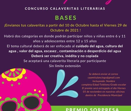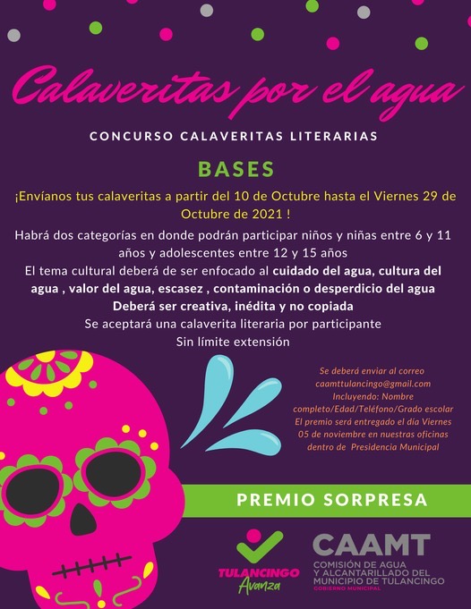 Por ello, el Departamento de Cultura del Agua, en coordinación con el Departamento de Comunicación Social perteneciente a la CAAMT, hace extensiva la invitación a participar en el concurso de “Calaveritas Literarias por el agua”, el cual, como ya se mencionó, busca promover, también, el valor que tiene el vital líquido y concientizar a las nuevas generaciones del cuidado del agua.