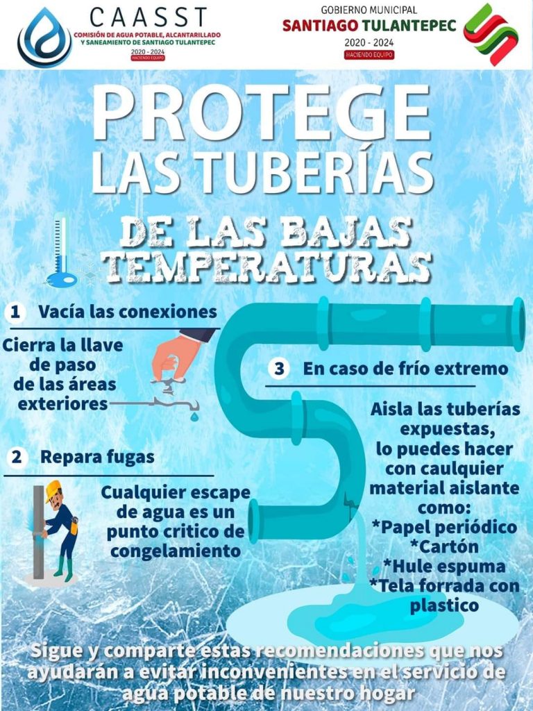 La Comisión de Agua, Alcantarillado y Saneamiento de Santiago Tulantepec (CAASST) a través de su titular Jesús Alejandro Ruiz León, exhorta a la población santiaguense, a proteger sus tuberías, esto con la finalidad de evitar daños y posibles fugas a causa del descenso considerable de temperatura que se ha presentado en los últimos días.