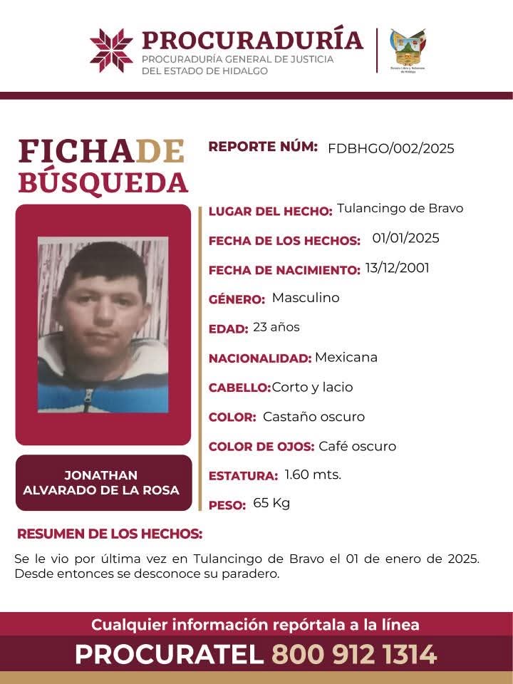 Uno de esos casos es el primero de esta índole que ocurre en 2025, y se trata de Jonathan Alvarado de la Rosa, a quien la Procuraduría asignó la ficha de búsqueda BHGO/002/2025.
