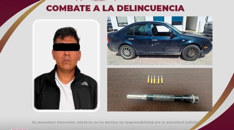 De manera simultánea, elementos de seguridad lograron intervenir al segundo vehículo involucrado; un automóvil tipo Jetta, con placas del Estado de México, el cual funcionaba como “muro” para los asaltantes y que era conducido por un hombre identificado como A. Q. R., de 38 años, a quien se le decomisó un arma artesanal, tipo lápiz y cinco cartuchos calibre .22.