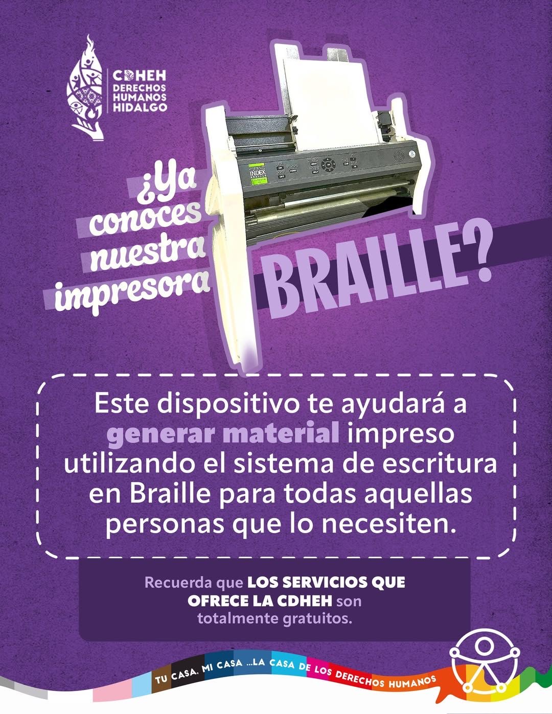La Comisión de Derechos Humanos del Estado de Hidalgo (CDHEH) ha dado un paso firme en materia de inclusión al poner a disposición de personas ciegas y con discapacidad visual —así como de colectivos, organizaciones civiles, activistas, instituciones educativas, dependencias públicas y ciudadanía en general— el uso gratuito de una impresora Braille.